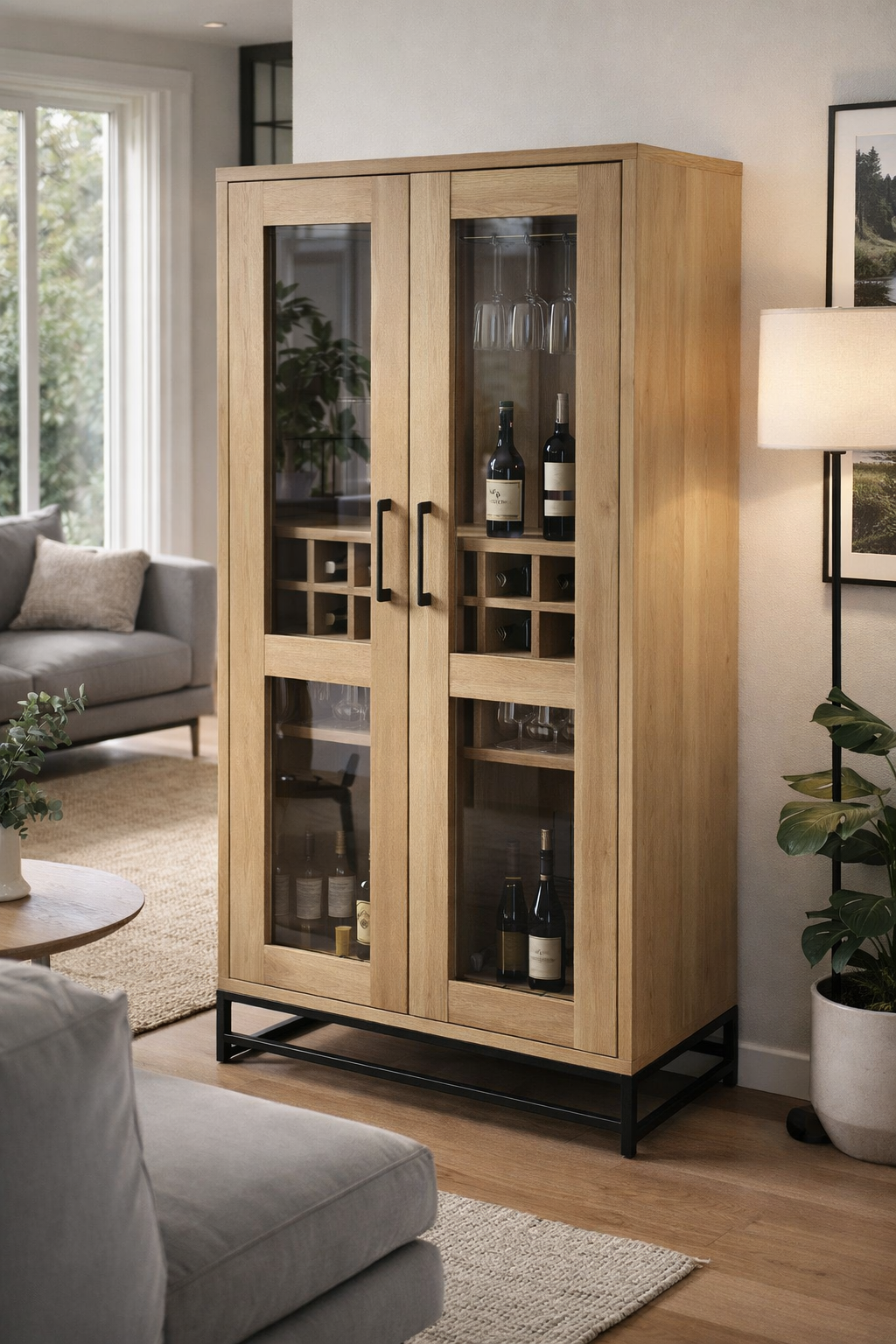 Sus puertas de vidrio permiten exhibir tu colección de vinos, copas y licores de forma elegante, mientras que su distribución interior está pensada para optimizar el almacenamiento sin perder estética. Ideal para living, comedor o terraza techada, esta vitrina se convierte en el centro de atención de cualquier ambiente.